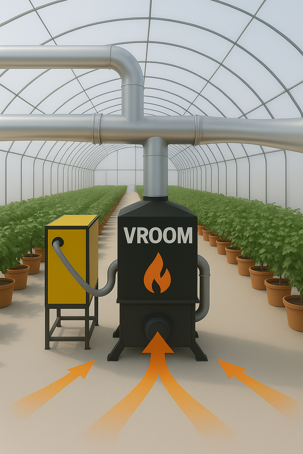 VROOM, 1000 m² kapalı alanı ortalama 25°C sıcaklık artışıyla hızlı şekilde ısıtabilen, yüksek verimli bir sıcak hava ısıtma sistemidir.